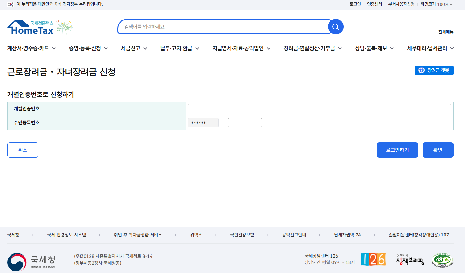 - 홈택스(hometax.go.kr) → 신청/제출 → 근로장려금 신청
