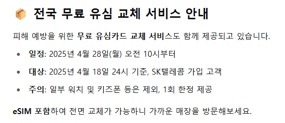 Q: 무료 유심교체는 몇 번까지 가능한가요? A: 이번 사고와 관련해서는 1회에 한해 무료로 교체 가능합니다.